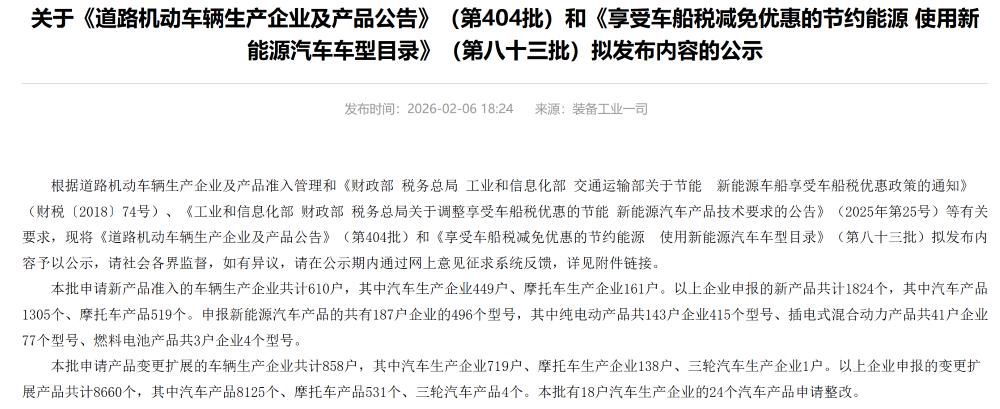 ▲工信部发布第 404 批《道路机动车辆生产企业及产品公告》