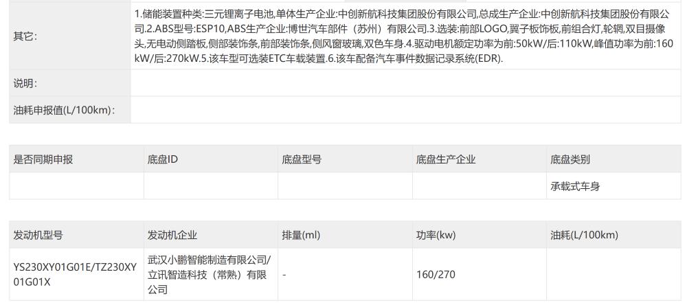 小鹏 GX 纯电版此次申报了双电机版,前 / 后驱动电机峰值功率分别为 160kW(约合 217 匹马力)/270kW(约合 367 匹马力)。