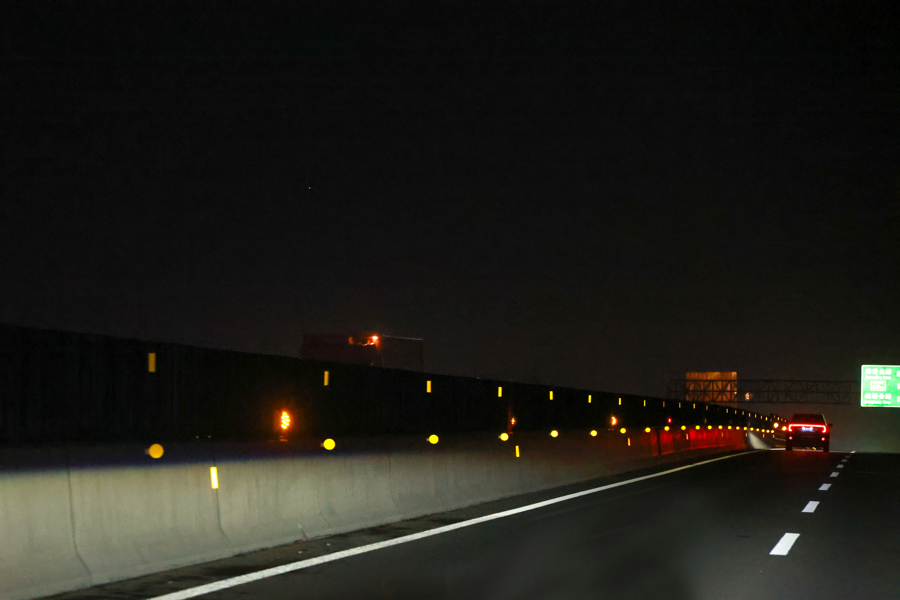 此外,贯穿全线铺设1万多个线性诱导黄灯,形成连续、均匀的流动光带,以每秒2次的柔和频闪工作。在长直线或缓弯路段,为驾驶员提供稳定、舒适的视觉引导,有效减轻长时间行车带来的视觉疲劳,帮助稳定行车轨迹。