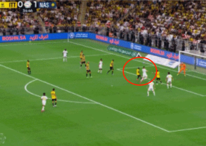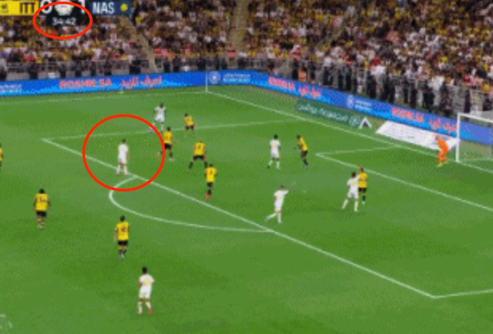 第35分钟,C罗展现了顶级射手的嗅觉。利雅得胜利前场推进到对方大禁区外, C罗尝试一脚远射,皮球被后卫封堵。随后,马内将皮球控制住。他看了一下禁区中路的形势,随即传中。